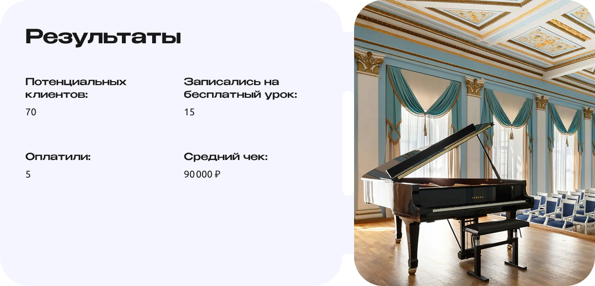 Так удалось определить контакты людей, действительно заинтересованных в обучении музыке, и довести их до записи на пробный урок.